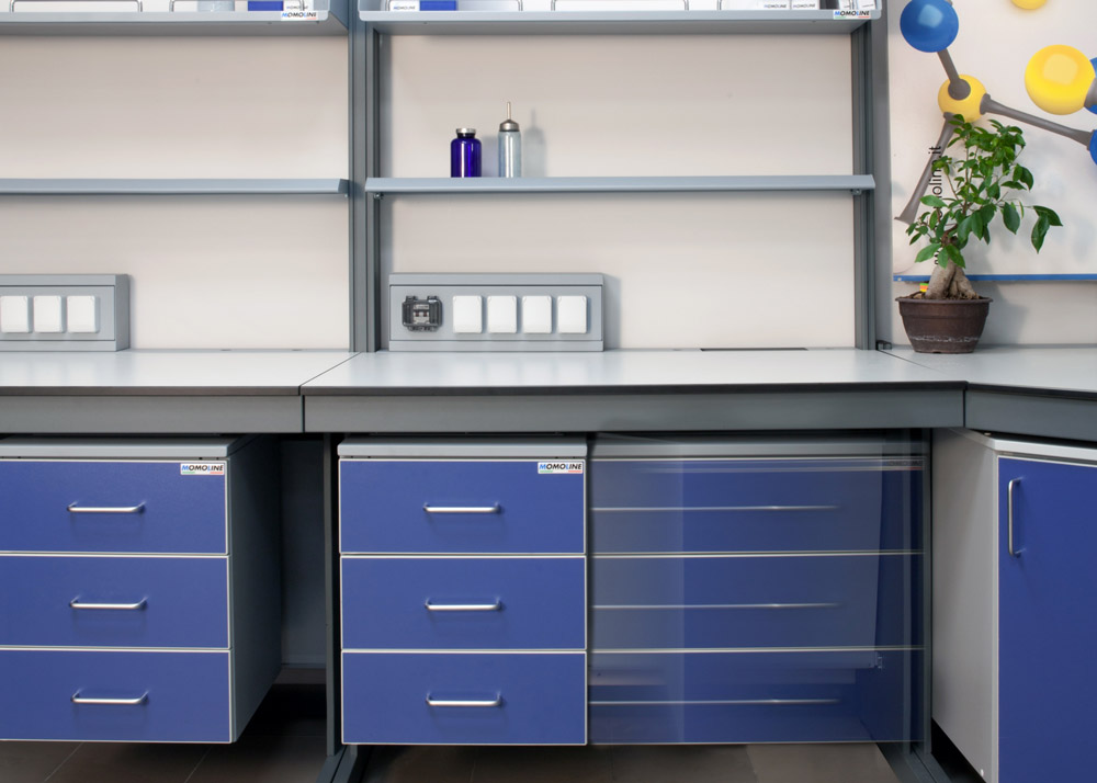 Laboratorieskåp erbjuder ett mycket brett utbud av alternativ och modeller: skåp under bänken (på hjul, på fötter eller upphängda i bänkkonstruktionen), överskåp eller höga förvaringsenheter.