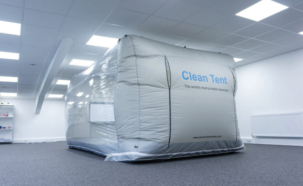 Filtrering med ULPA-filter för partikelfri miljö. Omslutande duk i PVC som skapar en luftig volym som hålls upp av kammarens övertryck. Fläkt- och filterneheten ger ett ställbart luftflöde i tältet med ren luft.