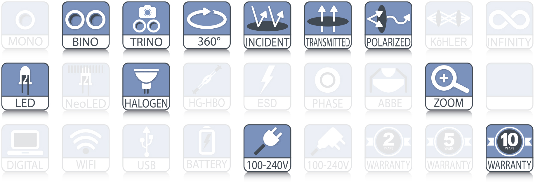 - 8 stereomikroskopshuvuden och 10 stativalternativ, kan fås i applikationsanpassat utförande